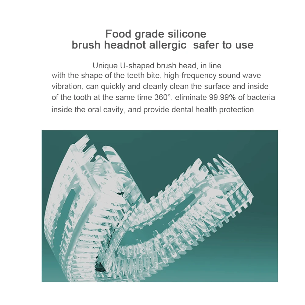 - U type tooth brush head design,using food grade silicone antibacterial soft material, 360° contact gums and teeth,Every time you brush your teeth,you can give your mouth a quick and comfortable experience
