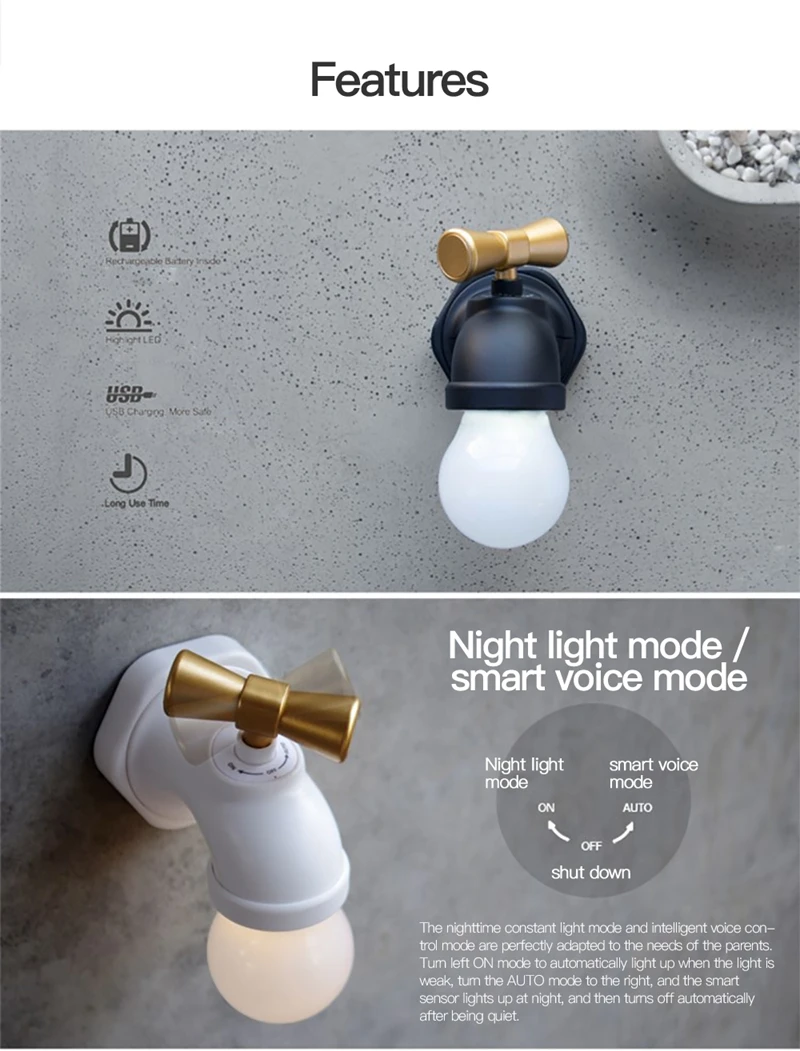 3. Rotate the night light switch to control the opening and closing of the night light. It is divided into three parts: regular bright, closed and intelligent. The intelligent block is a light-controlled automatic block. When the ambient light is darker, you need to feel enough decibels of sound. Night lights will automatically light up for 3 minutes, if there is no sound, they will automatically extinguish; if there is sound, they will continue to light up for 3 minutes, and so on.