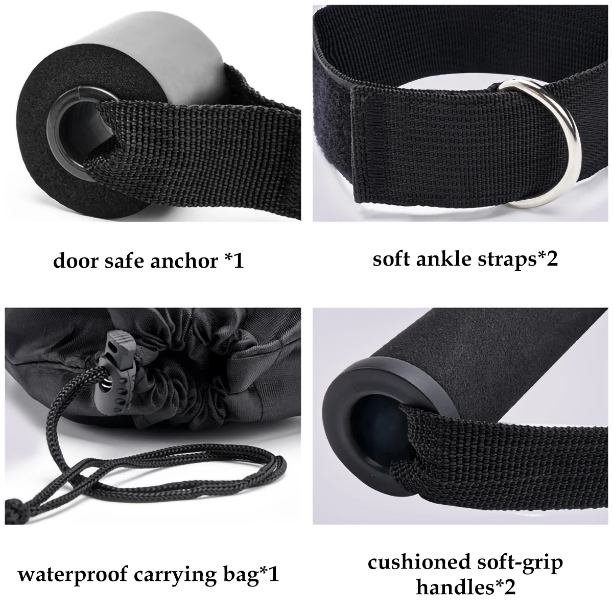 2 handles, 2 foot sets, 1 door buckle, 1 net bag, 5 pull ropes