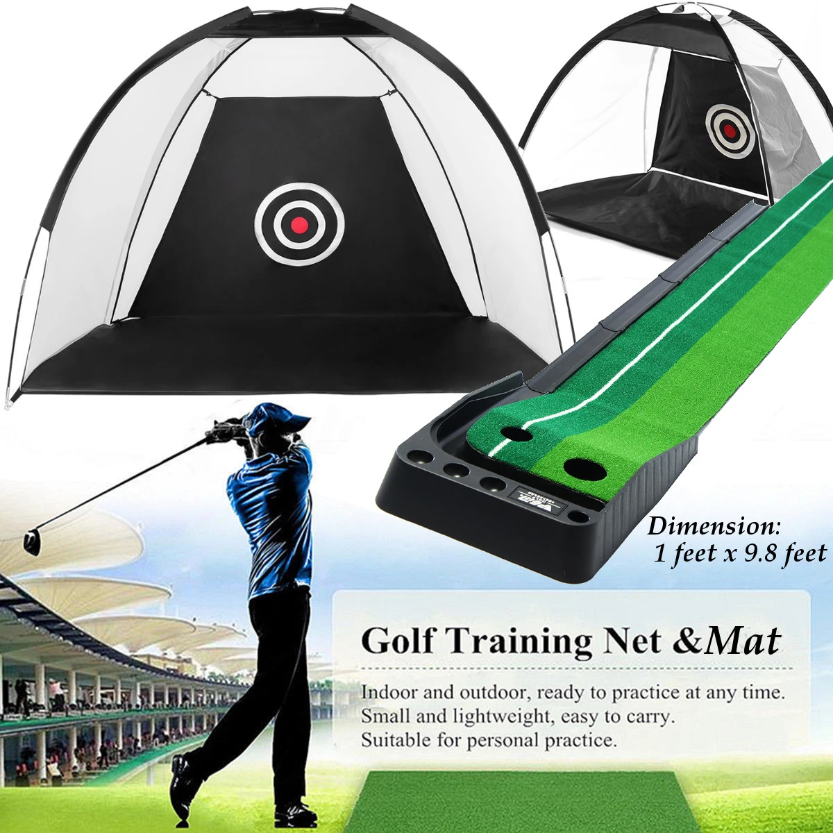 The golf training net is made with high-quality materials for durability and safety, easy to set up and take down in seconds. -Polyester floor collects golf balls for easy pickup.