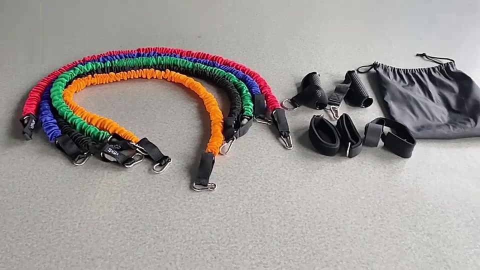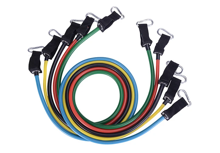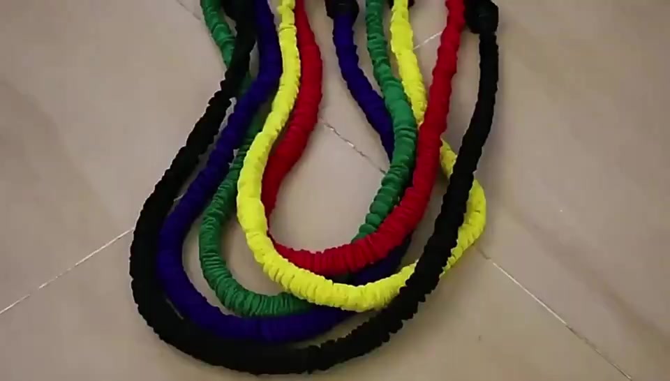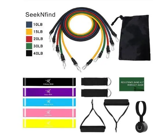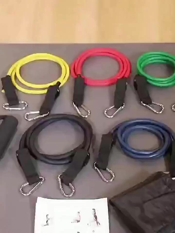 5 * elastic bands: black (30 lbs), blue (25 lbs), red (20 lbs), green (15 lbs), yellow (10 lbs)
