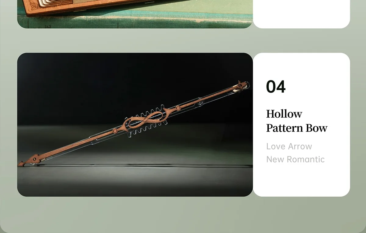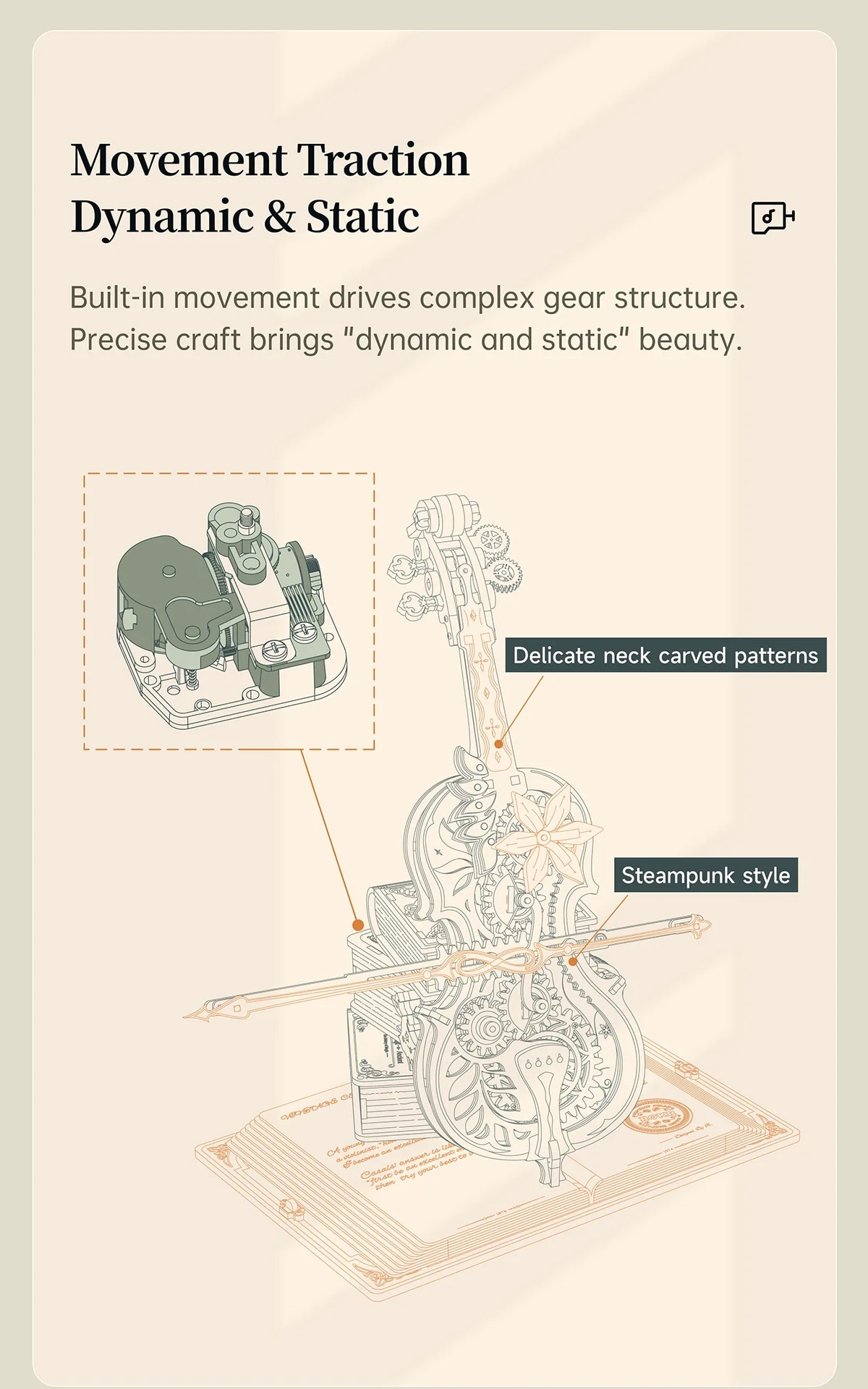 With a romantic retro style, this cello music box puzzle is mainly a combination of cello and magic book. The hollow structure of the body shows the internal gear set, six-petal flower embellished on it, the panel is engraved with a classic European pattern, very retro aesthetic. The product is also interspersed with a large number of magic elements, such as magic books, little witches and cats, giving people a retro and mysterious visual experience. In addition, the base of the magic book shape, using the story of the "father of the cello" Pablo Casals, and the main self-playing cello echoes.